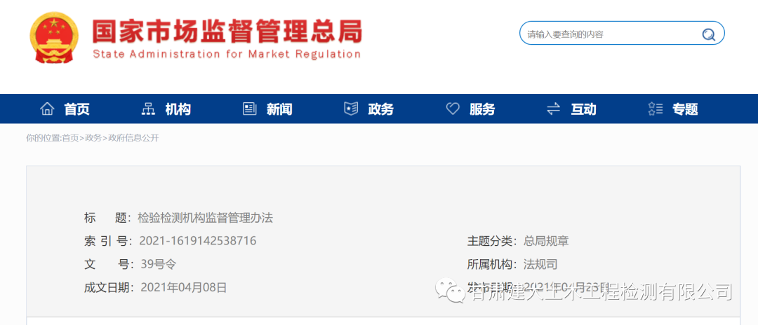 國家市場監督管理總局令 第39號 《檢驗檢測機構監督管理辦法》已經2021年3月25日國家市場監督管理總局第5次局務會議審議通過,現予公布,自2021年6月1日起施行。