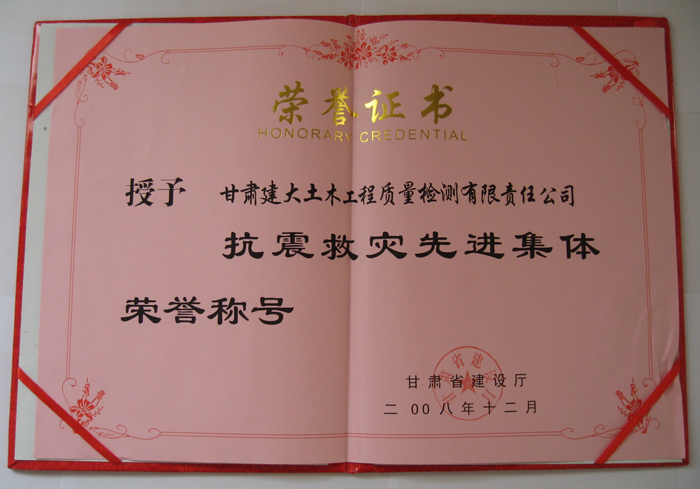 2008年12月我單位甘肅建大土木工程質量檢測有限責任公司被甘肅省建設廳授予抗震救災先進集體榮譽稱號。